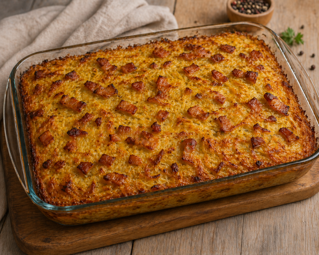 Jums reikės: 2 kg bulvių, 2 didelių svogūnų, 200 ml karšto pieno, 3 kiaušinių, 200 g rūkytos šoninės, druskos ir pipirų.